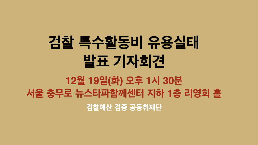 1. 12월 19일(화) 오후 1시 30분, 서울 충무로 뉴스타파함께센터 지하 1층 리영희 홀에서 검찰예산 검증 공동취재단(세금도둑잡아라, 투명사회를 위한 정보공개센터, 함께하는 시민행동, 뉴스타파, 경남도민일보, 뉴스민, 뉴스하다, 충청리뷰, 부산MBC)은 기자회견을 엽니다.